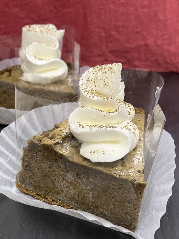 秋の味覚のかぼちゃのムースの中にキャラメルのムースを入れて土台にはチョコスポンジとソースを敷いたなめらかで舌触りの良いケーキです。