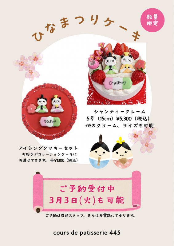 (価格はすべて税込です) ひなまつりケーキ(2026) 15センチサイズ 生クリームデコ 他のクリーム、サイズも可能 ¥5300 どのケーキにもお乗せ可能 アイシングクッキーのみも可能 ¥1300 シャンティ、ショコラ、フレーズ15センチ〜 ¥5300〜 アイシングクッキー、ぼんぼり、梅の花(たべれません) 12センチや他のデコレーションケーキは➕¥1300にてアイシングクッキーのみお乗せできます。 予約受付は2/22まで(在庫ある場合は可能です。) ケーキ引き取りは 2/25〜3/1。 3/3は定休日ですが、ご予約のみ対応いたします。(要相談) ホワイトデー商品(2025) 詰め合わせ7個入りの焼き菓子 大 ¥2200 クッキー缶7種類のクッキーがはいります。 小 ¥2500 大 ¥3200 予約賜ります。 販売期間 3月8日〜3月16日 消費期限は3月28日までとなります。 バレンタイン商品(2026) テリーヌショコラカカオ65%以上を使用した濃厚なチョコレートケーキです。 少しずつカットしながらお召し上がりください。 消費期限は冷蔵1週間冷凍1ヶ月 ¥3500(税込) 箱、袋付 焼き菓子セットアイシングクッキー、ビスコッティ、シナモンショコラ、ショコラメレンゲ、ケイクカフェ ¥2000(税込) テリーヌショコラ、各種ショコラは数に限りがありますので、2本以上の方は予約をおすすめいたします。 クリスマスケーキ 2025 シャンティー 12センチ地元安城産のイチゴと北海道産純生クリームを使用したクリスマス使用のデコレーションです。 卵アレルギー対応のケーキも賜ります。 マカロンはいちごにかわります。ただし、卵、小麦、ピーナッツを含む製品と共同の設備で製造しています。詳細はお問い合わせください。 12センチ ¥4,200 4名用 シャンティ 15センチ地元安城産のイチゴと北海道産純生クリームを使用したクリスマス使用のデコレーションです。 卵アレルギー対応のケーキも賜ります。 マカロンはいちごに変わります。 クッキーは卵なしになります。ただし、卵、小麦、ピーナッツを含む製品と共同の設備で製造しています。詳細はお問い合わせください。 15センチ ¥5,200 6名用 シャンティ 18センチ地元安城産のイチゴと北海道産純生クリームを使用したクリスマス使用のデコレーションです。 シュガーパルフェさんのクリスマス限定アイシングクッキーをのせました。 卵アレルギー対応のケーキも賜ります。 アイシングクッキーは卵を使用しております。ただし、卵、小麦、ピーナッツを含む製品と共同の設備で製造しています。詳細はお問い合わせください。 18センチ ¥6,800 8名用 21センチ ¥7,800 10名用 シフォン・ノエル 17センチ 限定30台 当店で人気のバニラシフォンケーキに茨城県産私栗クリームと北海道産生クリームを使用したクリスマスケーキです。 17センチ ¥5,200 6名様用 タルト・フレーズ 16センチ 18センチ 安城産イチゴと自家製ミルクジャムを混ぜ合わせたミルククリームとカスタードクリームを載せたタルトです。 16センチ ¥5,700 6名様用 18センチ ¥6,900 8名様用 ショコラ・ノエル 24.25日のみの販売ショコラ生地にのベリーのクリームサンドした切り株風チョコレートケーキです。 注意)飾りは若干変わります。 12センチ 4名様分 ¥4,200 限定15台 フロマージュ・ノエル 外側はしっかりと焼き上げ中はとろりとした食感の濃厚なチーズの風味のケーキです 飾りは敢えてシンプルにしました。 15センチ ¥4200 6名様用 注意)飾りは若干変わります。 ガトーショコラ・ノエル 15センチビターチョコレートを使用した濃厚なガトーショコラです。 15センチ ¥3,600 6名様用 注意)飾りは若干変わります。 クリスマスケーキ 2024 シャンティー 12センチ地元安城産のイチゴと北海道産純生クリームを使用したクリスマス使用のデコレーションです。 卵アレルギー対応のケーキも賜ります。ただし、卵、小麦、ピーナッツを含む製品と共同の設備で製造しています。詳細はお問い合わせください。 12センチ ¥4,000 4名用 シャンティ 15センチ地元安城産のイチゴと北海道産純生クリームを使用したクリスマス使用のデコレーションです。 卵アレルギー対応のケーキも賜ります。ただし、卵、小麦、ピーナッツを含む製品と共同の設備で製造しています。詳細はお問い合わせください。 15センチ ¥5,000 6名用 シャンティ 18センチ地元安城産のイチゴと北海道産純生クリームを使用したクリスマス使用のデコレーションです。 卵アレルギー対応のケーキも賜ります。ただし、卵、小麦、ピーナッツを含む製品と共同の設備で製造しています。詳細はお問い合わせください。 18センチ ¥6,500 8名用 シフォン・ノエル 17センチ 限定30台 *24日、25日のみの販売となります。当店で人気のバニラシフォンケーキに栗クリームと北海道産生クリームを使用したクリスマスケーキです。 17センチ ¥5,000 6名様用 タルト・フレーズ 16センチ 18センチ 安城産イチゴと自家製ミルクジャムを混ぜ合わせたミルククリームとカスタードクリームを載せたタルトです。 16センチ ¥5,500 6名様用 18センチ ¥6,700 8名様用 ショコラ・ノ