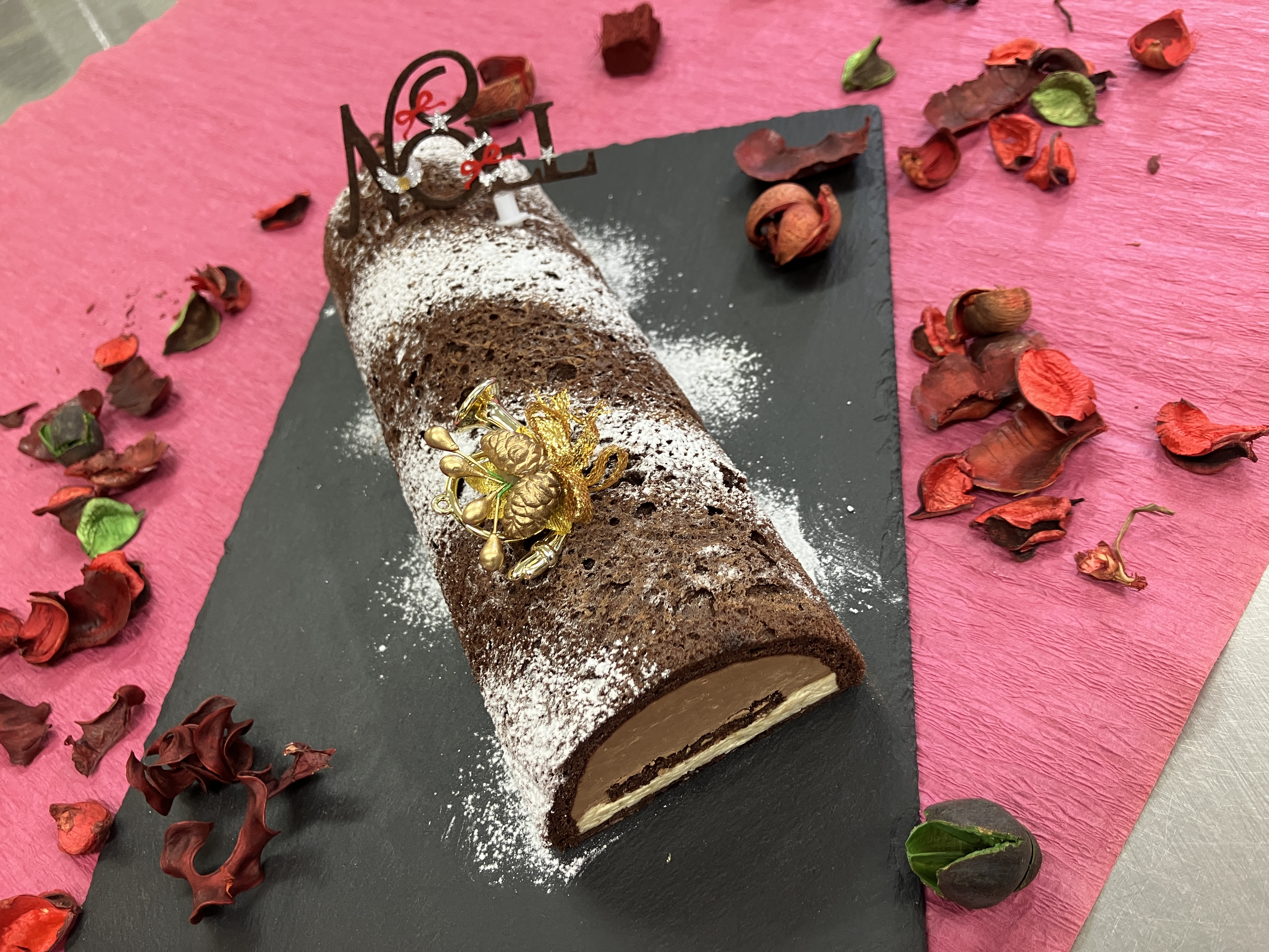 ビターチョコのムースとラムレーズンのムース(アルコール無し)をトヨ型で仕上げます。