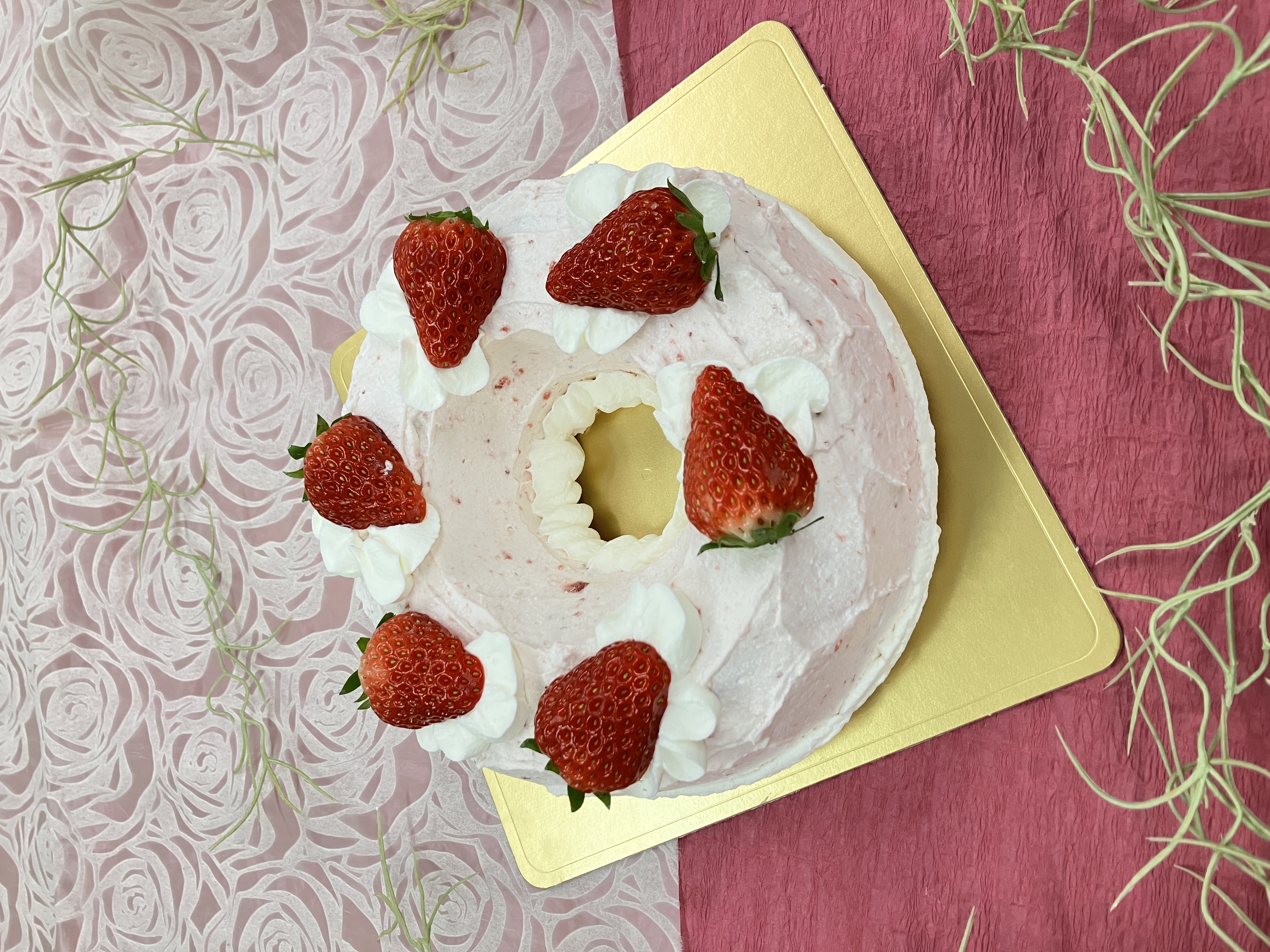 エンゼル型を使用します。軽い生地にディプロマットクリームといちごクリームでデコレーションします。